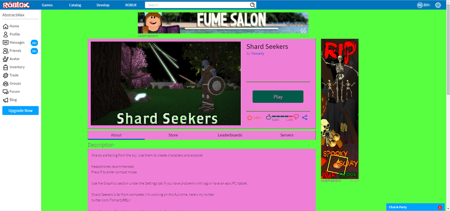 I’ve got some very non-robloxy looking stuff on my game-page. Yes, there are ads which ruin the aesthetics a bit but if we could recolor the different sections a bit per-game that would be great. I scribbled over the sections that could be recolored. They would be two colors. It’d be even cooler if roblox let us apply materials over them (from in-game). I would make the white portions use grey DiamondPlate and the the background use black Metal.