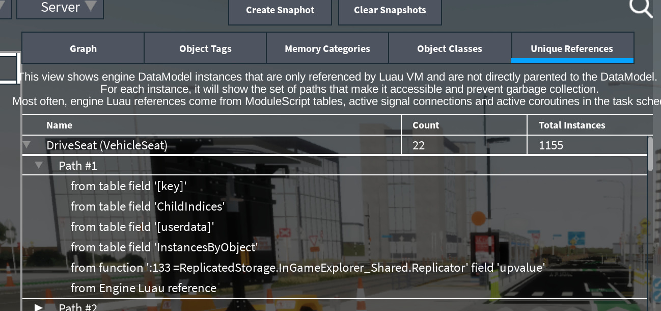 I recommend checking the developer console for memory leaks, for example instances that are not destroyed. It can be cleared by unparenting, but if a table still references it in its keys or values, it cannot be collected by the gc, hence why it still exists. Upvalues can indicate that it’s stored somewhere up the recorded location.