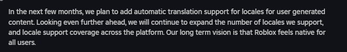 In the next few months, we plan to add automatic translation support for locales for user generated content. Looking even further ahead, we will continue to expand the number of locales we support, and locale support coverage across the platform. Our long term vision is that Roblox feels native for all users.