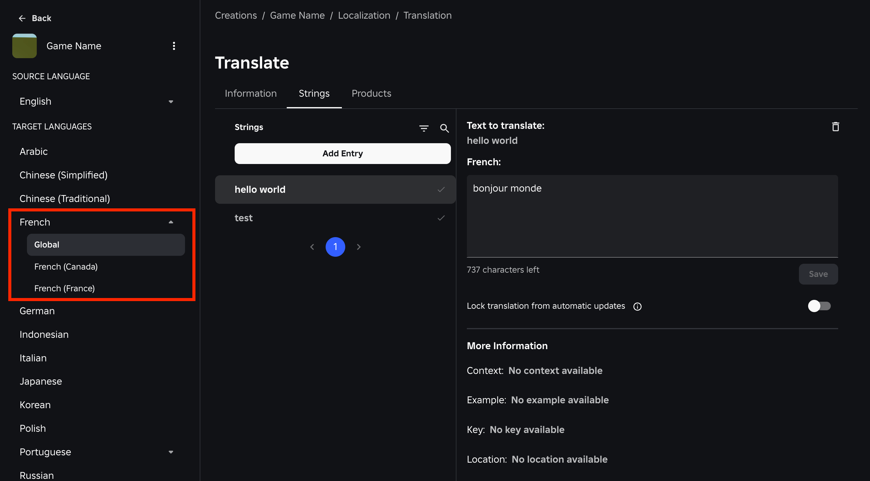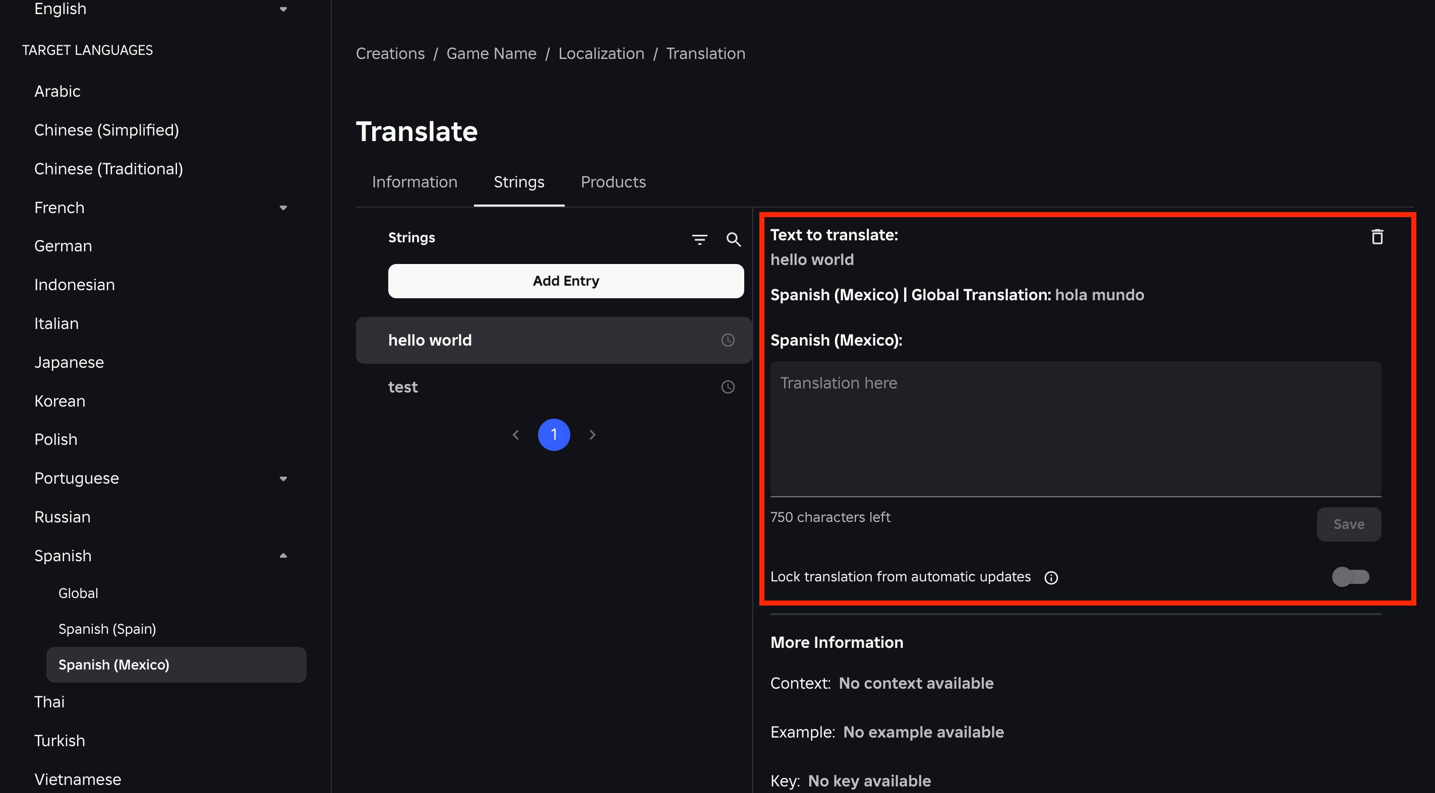 You’ll see a list of target languages on the left. For languages that have Roblox-supported locales, you’ll see subheadings under the parent language for global and locale-specific translations.