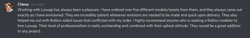 Hello! I’m Lunuap (he/him) and I am a Turkish 3D Artist and beginner Animator. I have been modeling for a year now and have been on Roblox since 2014, though I started developing in 2021. On another account I love modeling accessories and custom bodies or animals. I use Blender for my work and I use paint.net and gimp to texture. Many of my models have been used in upcoming games. I want to be able to improve my skills and bring more creativity to the Roblox community.