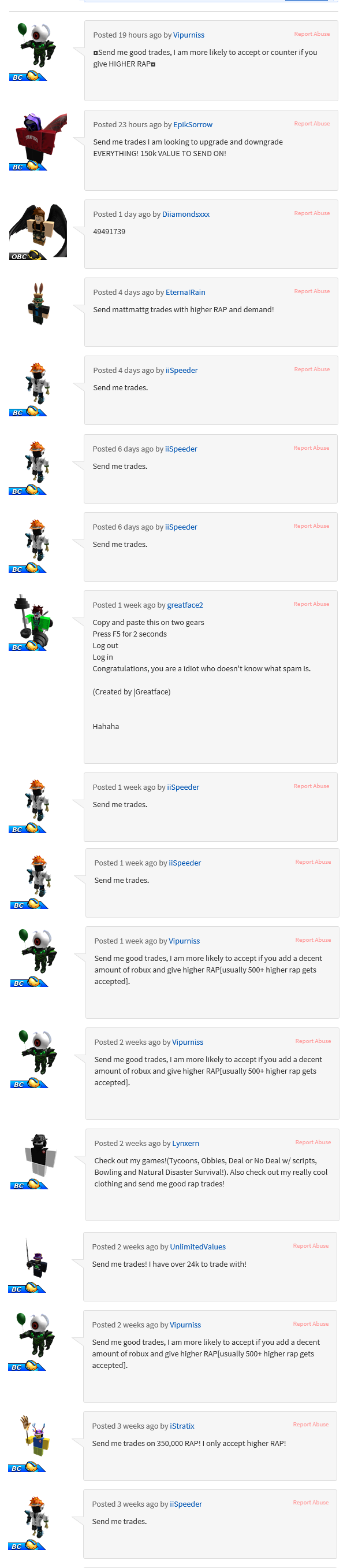 Comments are meant to give positive/negative feedback on an item, not to tell people to send people trades where the they get a profit.