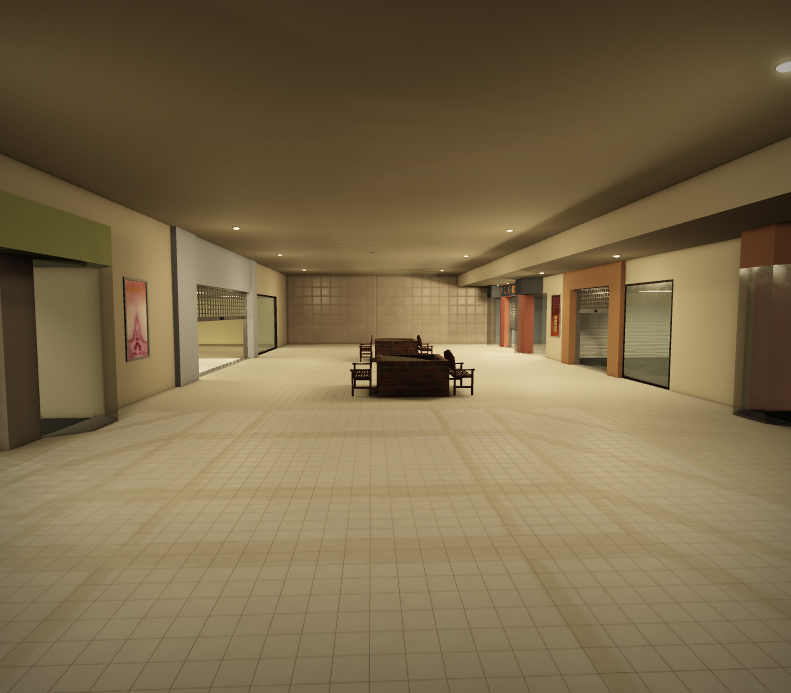 I think this mall is really good, however I would put more colours and shapes on the walls and make it a little bigger, similar to actual malls. I wouldn’t really put signs though. That would ruin the emptiness of the whole backrooms vibe. Add something in those stores if you haven’t yet (empty clothes stands, cash registers). Make it feel abandoned but clean, as if someone is actively cleaning the area.
