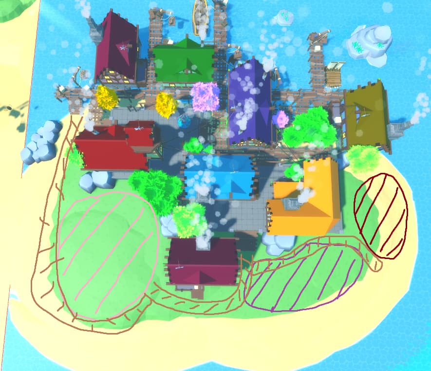I need help in making a “fishing” / dock Island. Here is a photo of it from the top. I need to fill the empty space (pink, purple and crimson). Future paths are marked in brown.