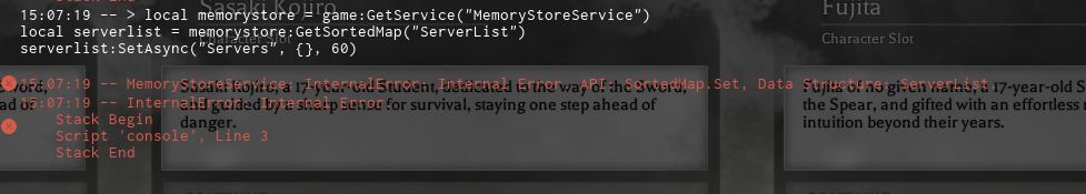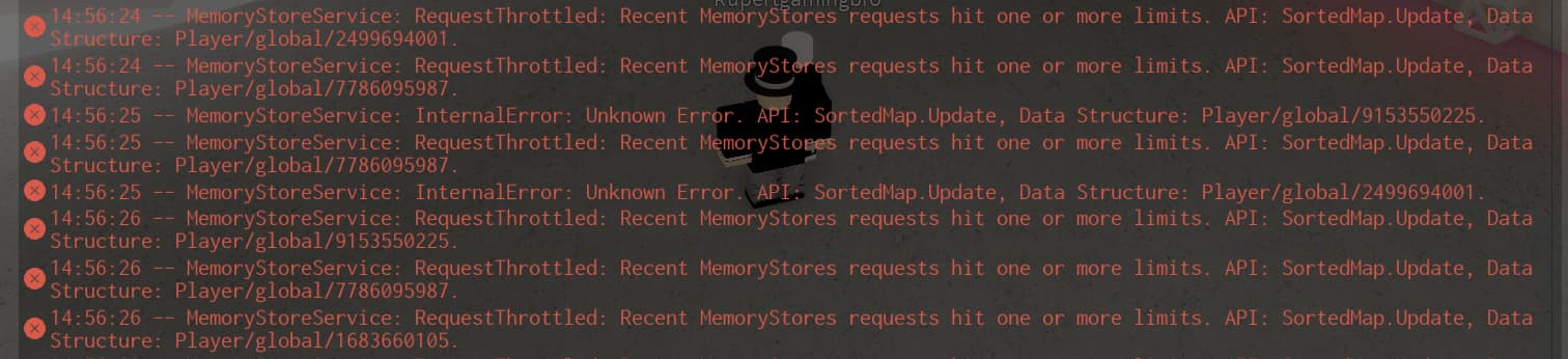 Currently in my game im being thrown an “internal error” trying to access MemoryStoreService, and after multiple attempts it just gets throttled?