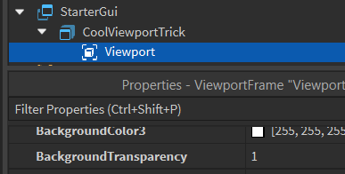 Next, create a SurfaceGui in StarterGui. Set it’s Adornee property to the “mirror part” created in the previous step. Also create a ViewportFrame inside of your SurfaceGui, and set its BackgroundTransparency to 1: