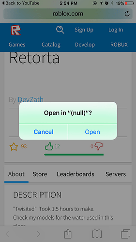 I was checking out an old video I had posted on Youtube of an ROBLOX tutorial, click the link to go to the place it was showcasing and when I clicked play you get this error message! Something that should not be hard to fix but It would be convenient for new users or people who have not heard of ROBLOX to be linked to the App Store App. If I remember correctly it works if you actually have the ROBLOX app. Didn’t try it though as I don’t have the app anymore.