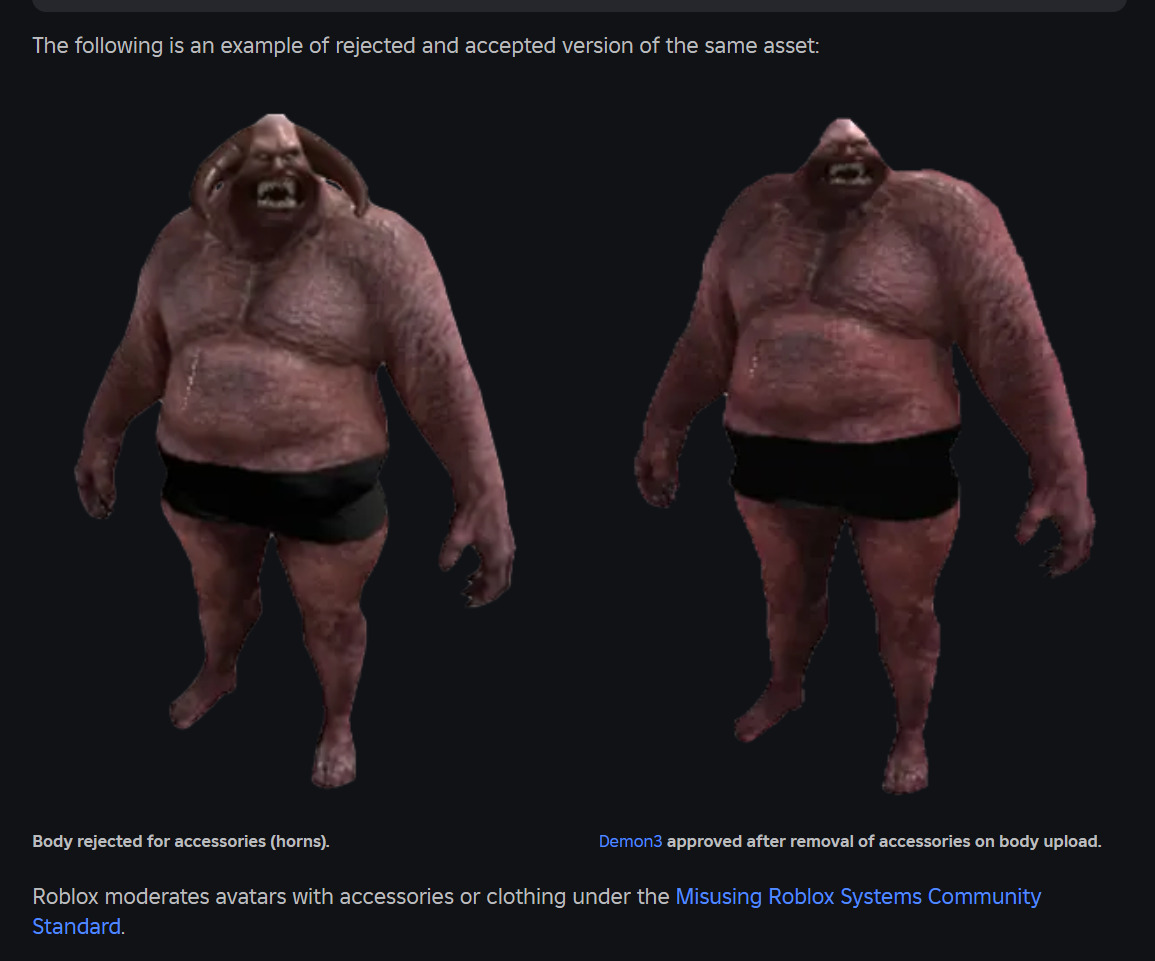 Recently avatar bodies was opened up to UGC creators, while the feature is both exciting and fun to use it has been plagued with issues regarding moderation. Moderation take far too long and there seems to be a widespread problem with avatars being rejected even though majoirty of people who have made, have claimed that they had followed the validation criteria and passed it and rules in within the documentation and yet they are being rejected. It seems for me at least a little bit inconsistent as to what is causing the rejection. On one hand I thought maybe itâs because I avatar is too muscular and maybe thats considered as too âsexyâ but wait my other avatar has muscular body and so do others from other creator, the point being is that its hard to whats the main cause and it seems a bit inconsistent. Furthermore I upload a skeleton avatar, there was nothing that I can think that was inappriate about it, it passed validation. It wasnt sexualised (its a skeleton) nor was any gore/blood used to convey perhaps a zombie/undead theme eitehr way it was rejected. Another instance was a wasp humanoid that for one isnt even human so sexualization is already out of hte equation so again Iâm left confused and feel as though theres a bug flagging appriate content as inapproriate. Further, avatars that are rejected, the slots remain used even thought an item wasnât uploaded, this is very unfair and should be changed.