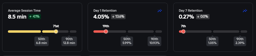 I have a game called “Blast Wars”. It’s a build to survive type of game that I’ve been solo developing for a while. I’ve been constantly updating it to the point where it almost feels like its own genre now. My metrics have been consistently increasing with every update. I’ve managed to grow almost every metric except PCR (because I’m struggling to improve that without relying on heavy FOMO driven methods). My player base has been giving positive feedback, and my QPTR improves every time I experiment with a new thumbnail.