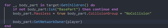 body_part.Massless = true body_part.CollisionGroup = "NoCollision" body_part:SetNetworkOwner(player)