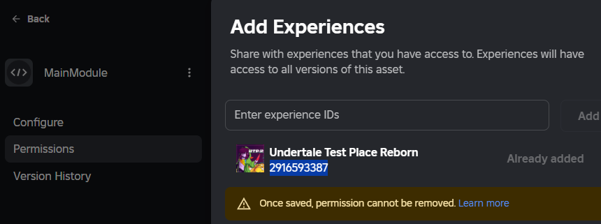 Hello, this issue seems to still have not been resolved, It also seems like ModuleScript permissions doesn’t work when shared with an experience, for example I’ve given the permission for AssetId 9370504709 to experience 2916593387, and yet when trying to LoadAsset or require() it simply doesn’t work, and when set to be open for the marketplace it does.