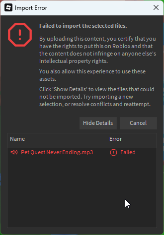 However another thing that my entire team has noticed since these recent changes is now the only person who can upload audio/sound files under our group/games is the group holder. No matter how many permissions we give to certain users, even the “Grant all available permissions” permission doesn’t give these people access to upload audio files to the group. This is still an active issue my entire team is encountering and this is the error message we get whenever we try to upload any sounds