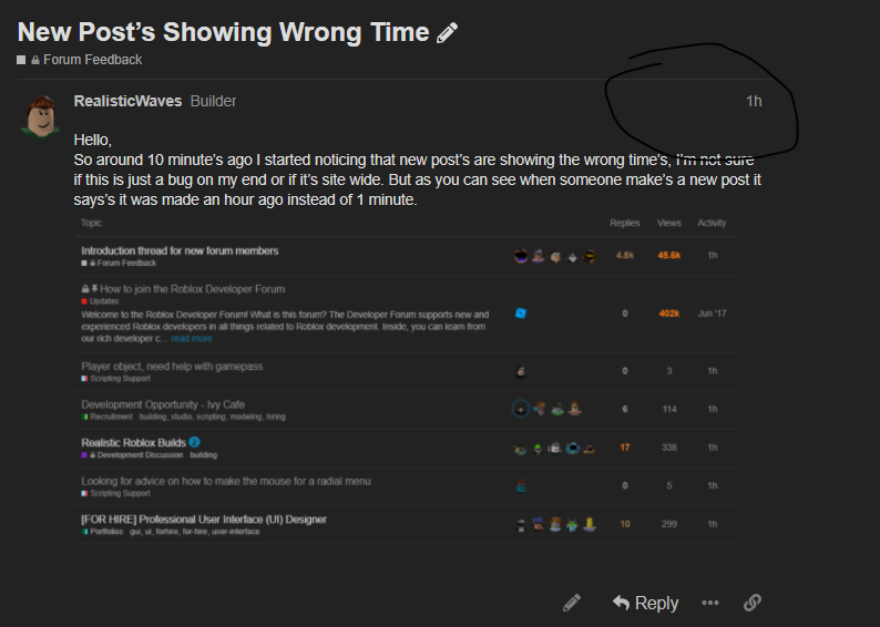 So around 10 minute’s ago I started noticing that new post’s are showing the wrong time’s, I’m not sure if this is just a bug on my end or if it’s site wide. But as you can see when someone make’s a new post it says’s it was made an hour ago instead of 1 minute.