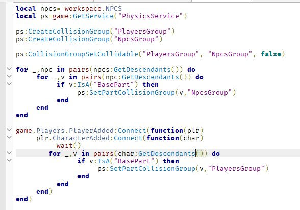 I’m having problems with the Physics service I just learned. This script prevents npc from touching players. But this script works in my test arena (that is, only baseplate in it). In my main game, npc can touch players.