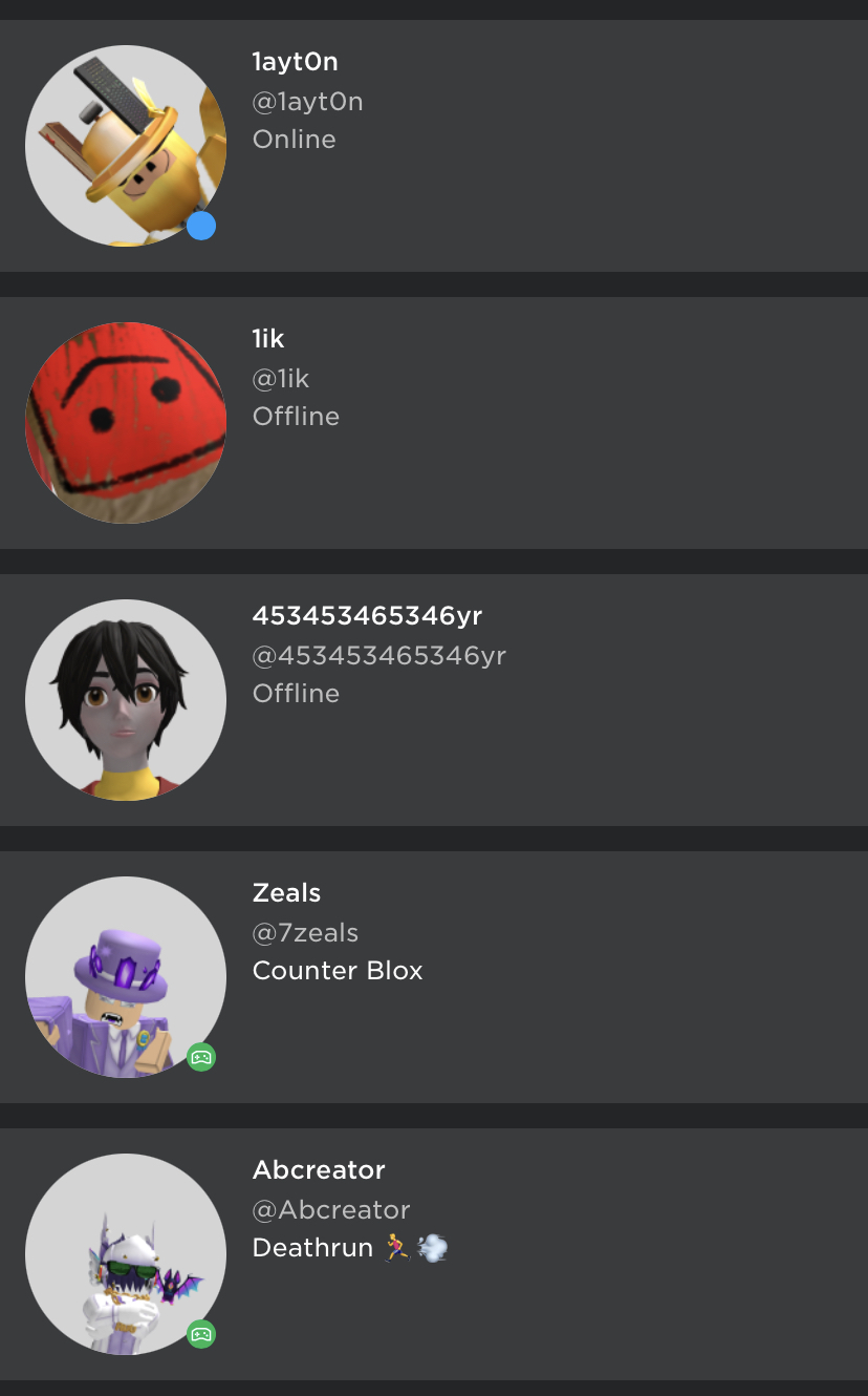 I would like to report a bug related to the resizing of player status icons on the Roblox application through mobile devices (and the website). The icons appear to be resized oddly, specifically for the vectors indicating player statuses for friends and non-friends. This issue can be observed when accessing a Roblox experience, particularly those created by groups, in the Developer section.