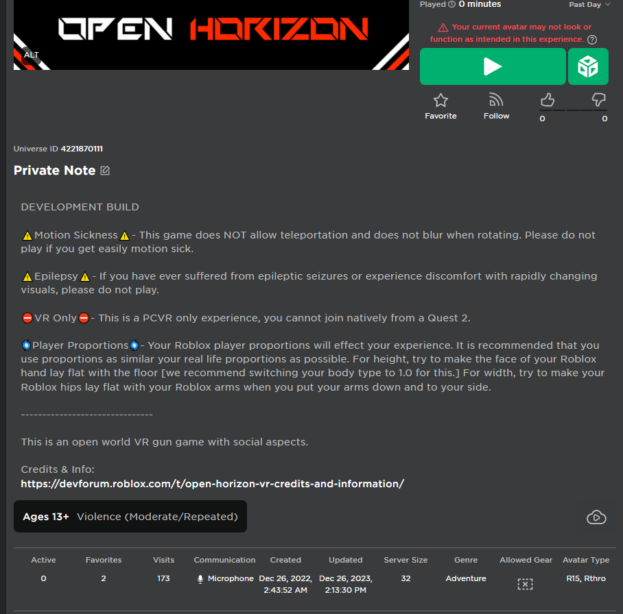 For these reasons, Open Horizon will not feature blood as particles and decals are very resource intensive for the Roblox engine. Most importantly, performance is one of the reasons why Open Horizon is not planned to be playable on Roblox’s official Quest app.