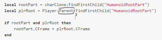 local rootPart = charClone:FindFirstChild("HumanoidRootPart")