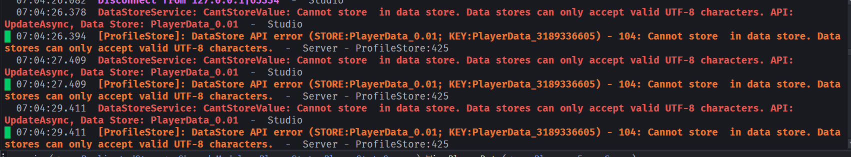 DataStore UTF-8 validation is between your data and Roblox. PlayerState isnāt a DataStore gatekeeper. If youāre storing nonāUTF-8 data, thatās on your code. The module forwards what you put in. I will go ahead and add some sort of validation for it in an update though.