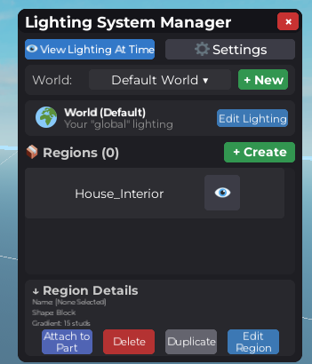 This would be very helpful rather than doing this manually with invisible parts and figuring when the player touched it to change lighting. This plugin essentially gets rid of all the complicated scripting! Suggestions? Well, not everyone would want text on the screen saying where they are when they can see themselves, so maybe an option where the text label isn’t there?Apart from that amazing plugin.