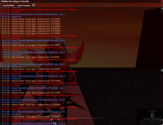 This is a bug that rears its ugly head sooner or later in every instance of my game. It would be almost okay if it simply errored and kept moving but this bug is actually killing my game. When it happens it prevents that server instance from making any more requests to PointsService, forcing me to shut down the server. I’m almost certain it’s related to some request limit. Can someone please fix this?