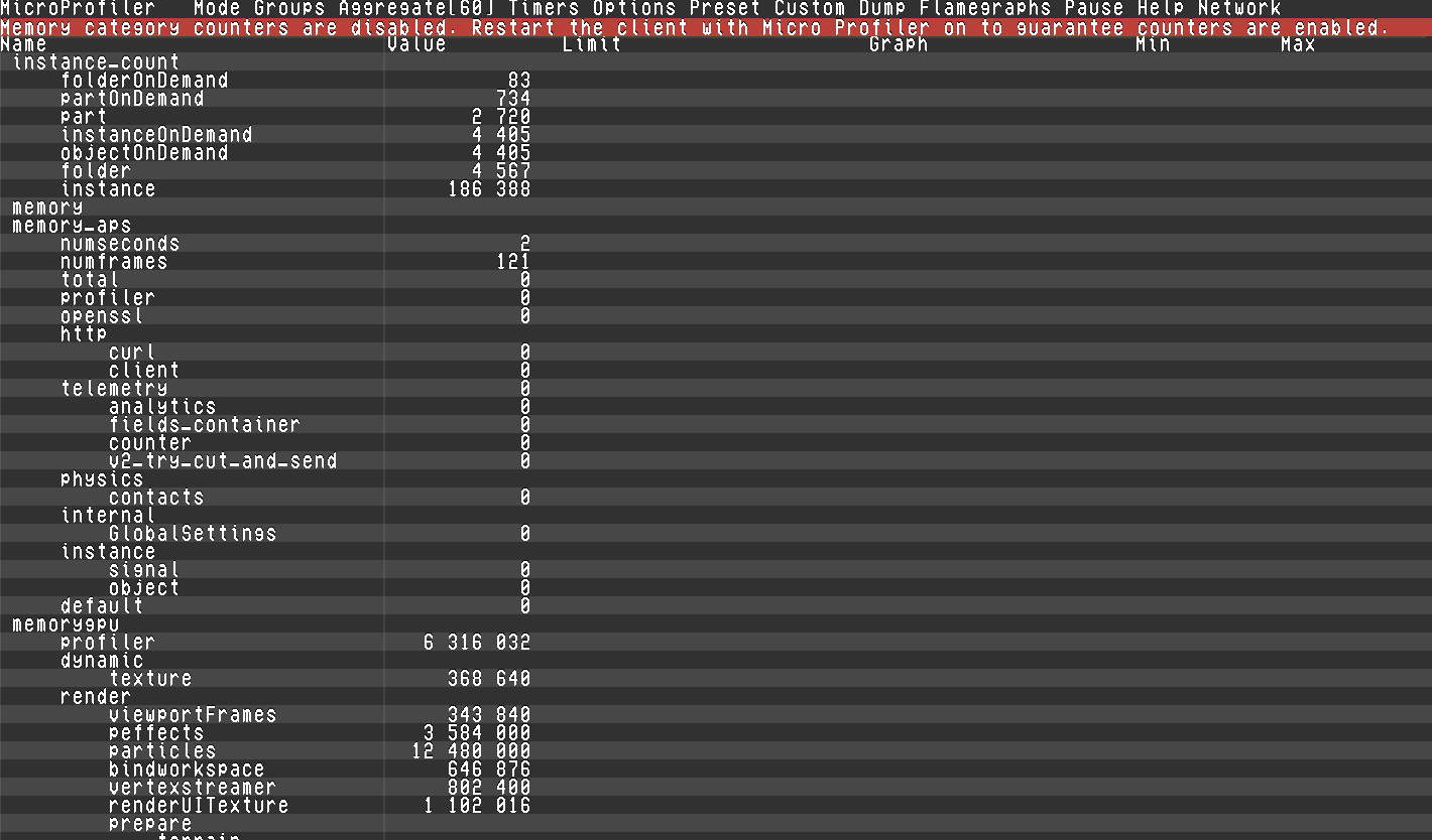 - You can still use the MicroProfiler to debug memory. When you enable the MicroProfiler, it will automatically force memory tracking to turn on for your next session, giving you access to all the memory counters you need. Remember to restart the client if tracking was already off. Luau memory usage view is not affected.