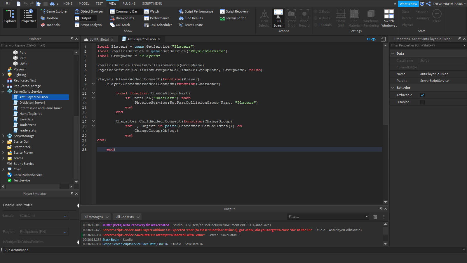 I have made an Anti Player Collison Script for my game to avoid trollers but it doesnt seem to be working here is the code: