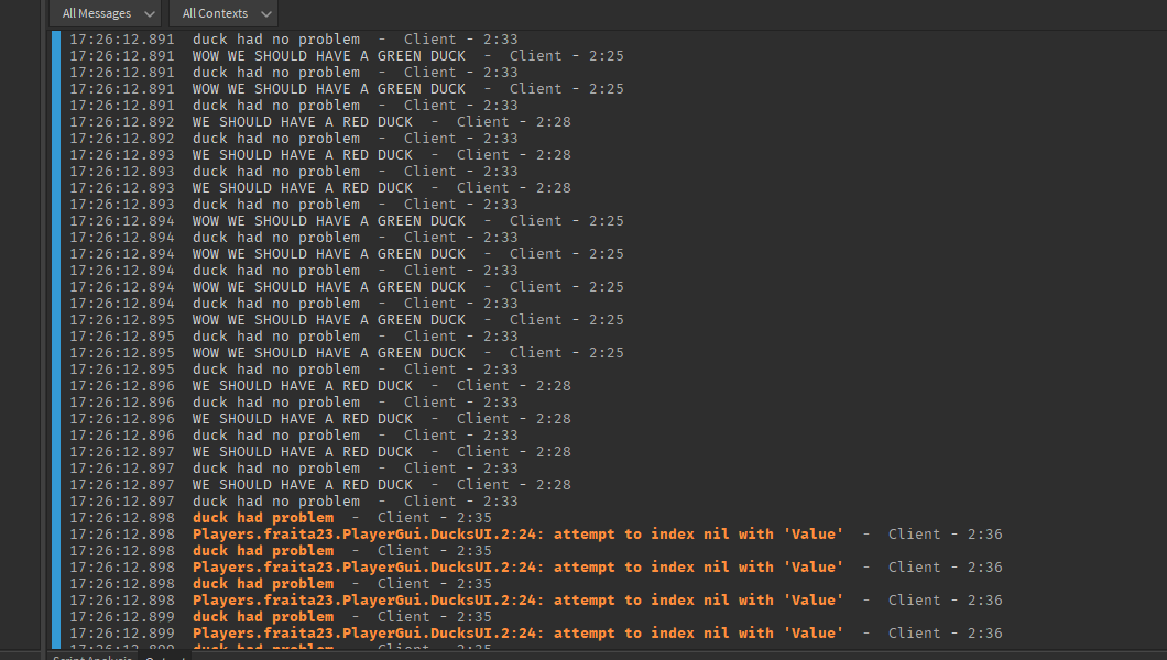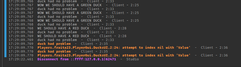I think I got it. So I think maybe DucksFound isn’t being instantiated quick enough. So by the time we are accessing it and making our gui, it doesn’t have all the bool values we would like to check.
