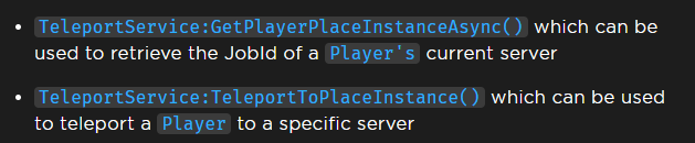 With these you can get the player’s server ID and teleport a different player to that specific server