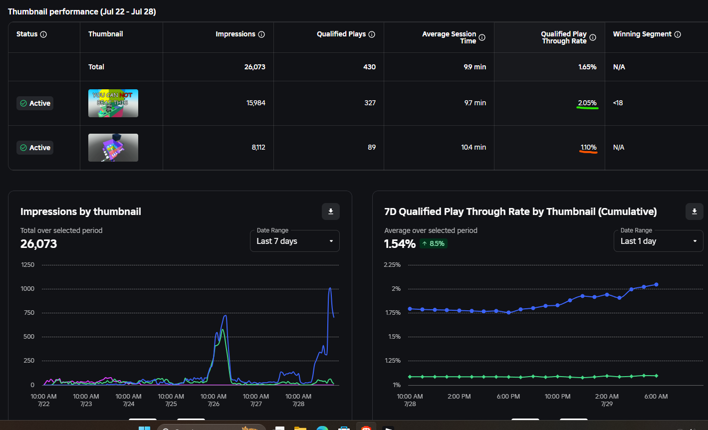 Currently, I’m using two thumbnails for the home page. One is clearly performing better (as shown in the image above), but I’m unsure what the best move is: