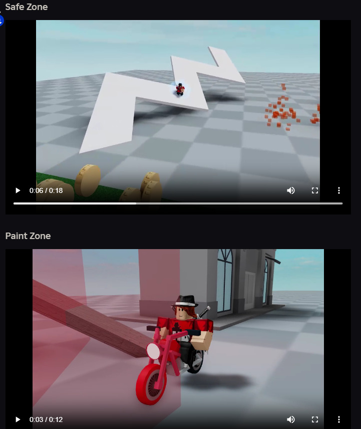 In the examples you showed, I would use QuickZone for the Safe Zone, Paint Zone, Voting Pads, Ambient Areas, NPC Damager and Sliding Doors.
