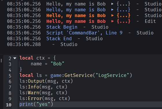 Logs a message at the Enum.MessageType.MessageError level and throws a structured error with optional context. As this method always throws, use pcall() to catch the error. The thrown error is a table with message, template, context, and stack fields, and a __tostring metamethod that returns the rendered message.
