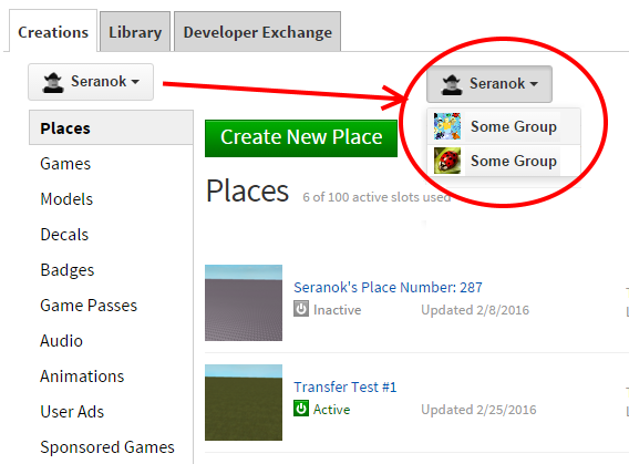 There are several places on the ROBLOX website where two tabs are shown: one for the user and one for his groups.