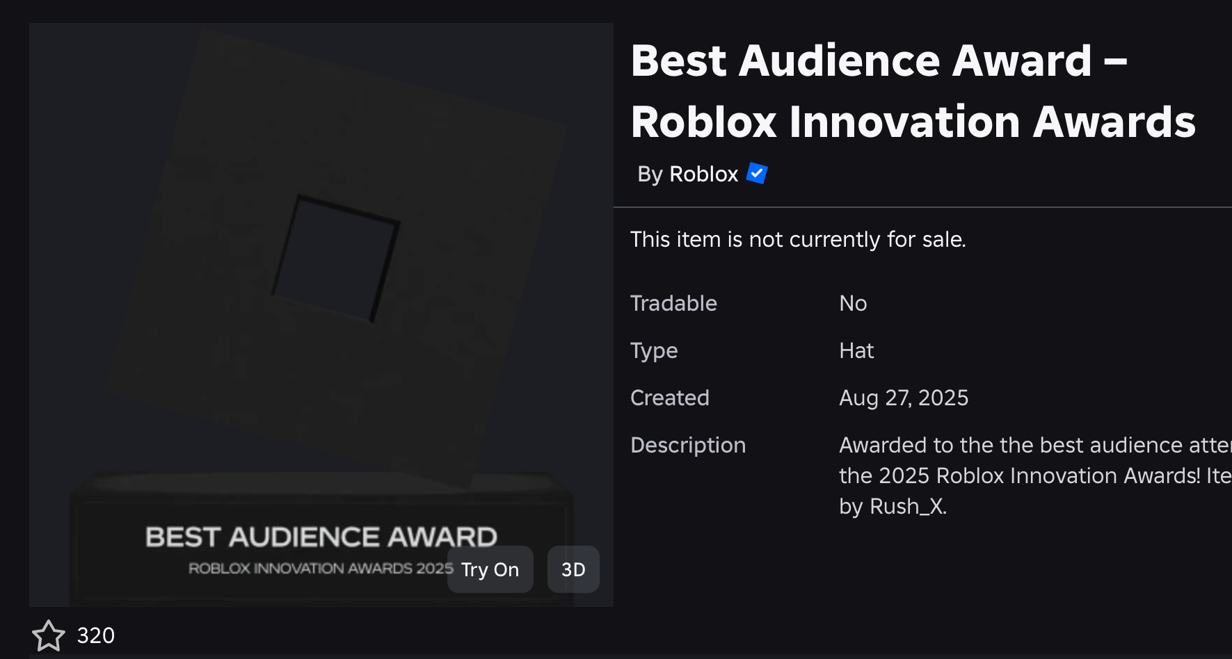 It’s possible that the audience award item is only for the in-person attendees since I don’t see a badge for this item in the voting hub. If that’s not the case then Roblox simply forgot to make the item obtainable in the experience.