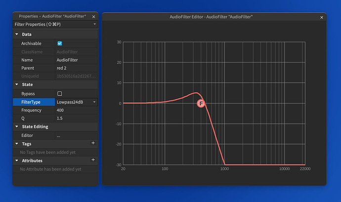 Just like with roll-off curves, we’ve applied an intuitive visual editor in Studio for the AudioFilter. This editor provides a draggable interface of the frequency response curve (the level of gain applied across the entire frequency spectrum) and allows for direct manipulation of Frequency, Gain, and resonance (Q)