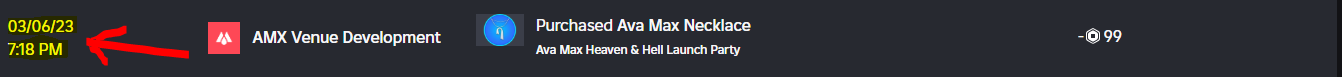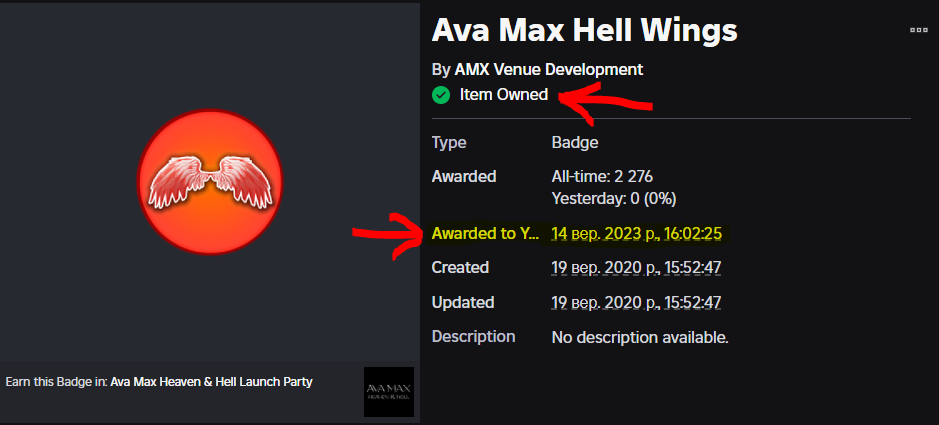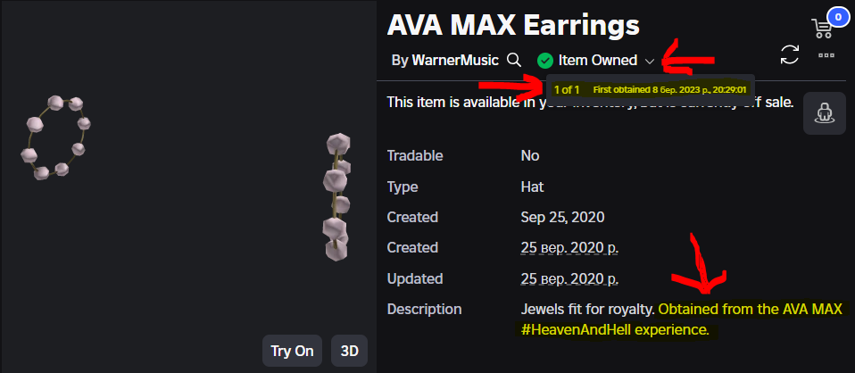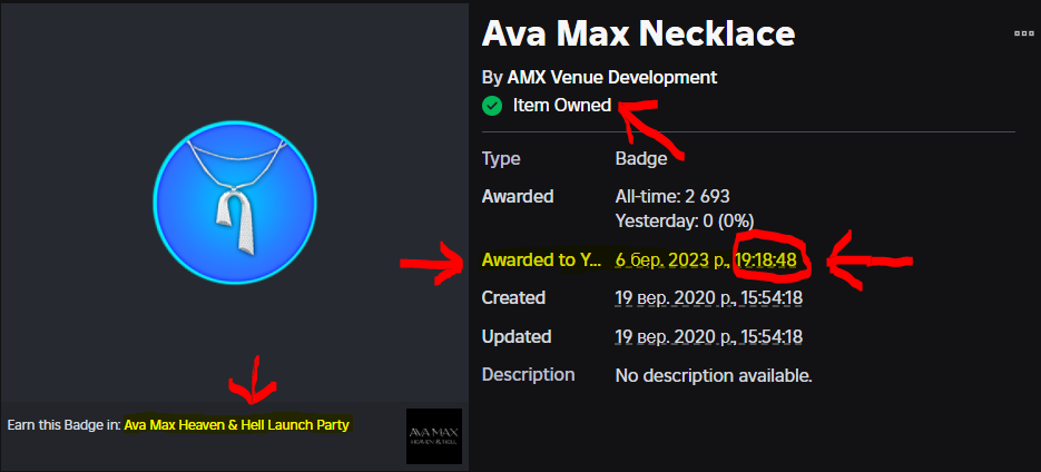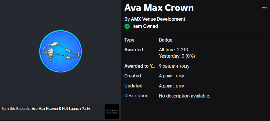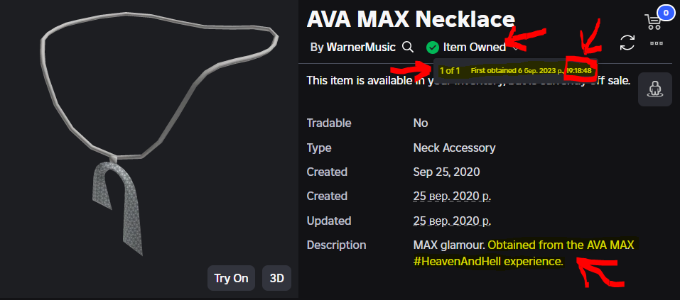 After purchasing a dev product inside of the official “Ava Max Heaven & Hell Launch Party” event and receiving a badge associated with the UGC item called “AVA MAX Necklace”, I successfully received this UGC item into my Roblox inventory: