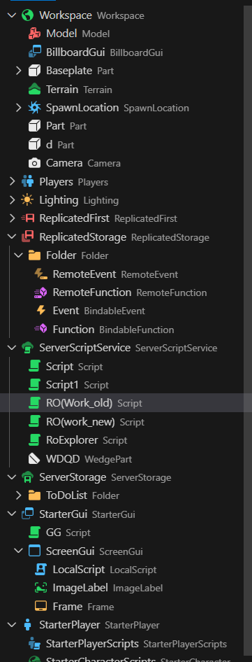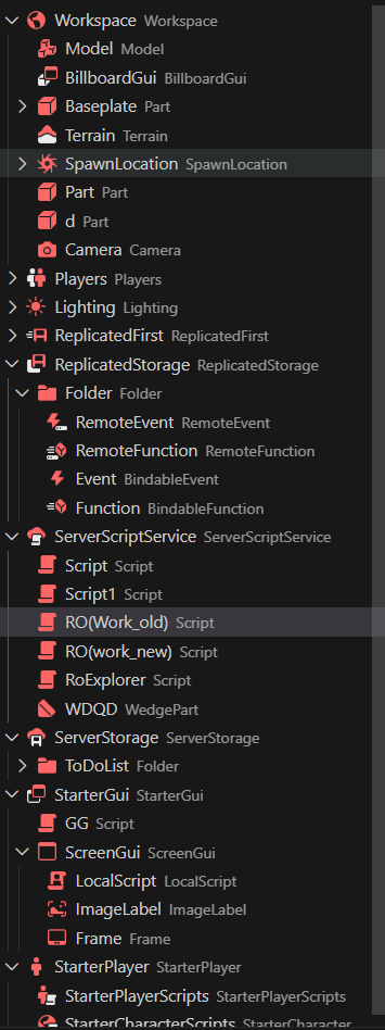 Full Explorer view – Access all services like Workspace, ReplicatedFirst, ReplicatedStorage, ServerScriptService, and more.