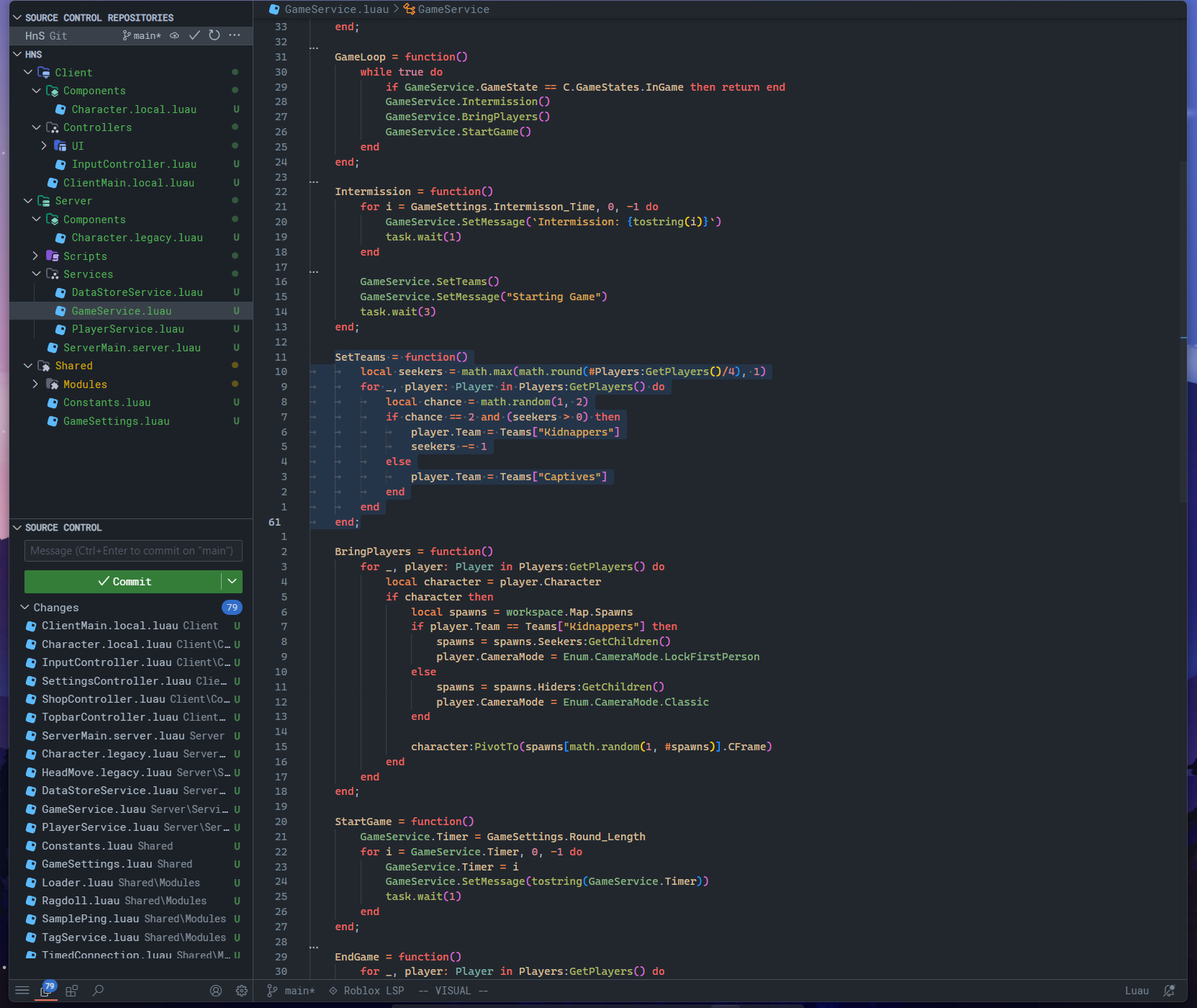 Also! I promise you cannot have your Roblox editor looking like this with VIM controls and custom actions with integrated Git controls as well. This personally works very well for me and is far more responsive than the Roblox Editor.