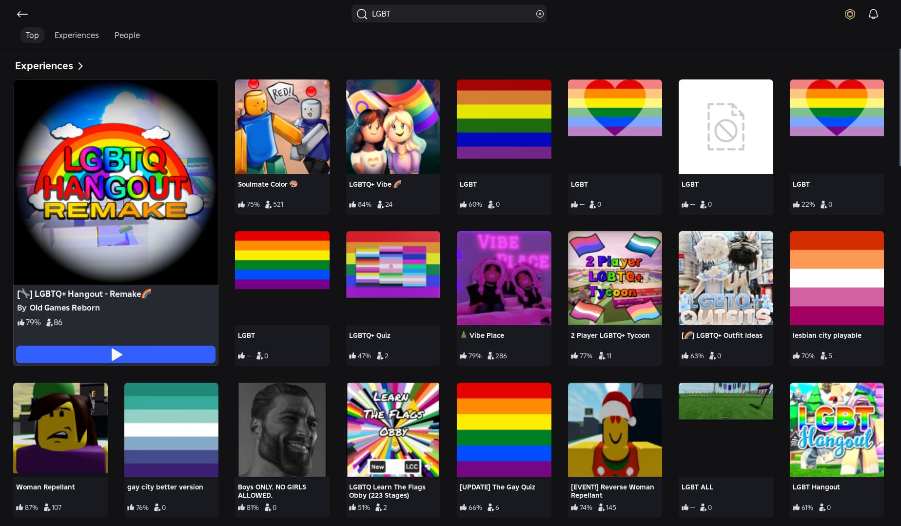 As for LGBT+ promotion, the only thing ROBLOX can do is try to use its filters to completely remove any games of this genre from regions in Russia. For example, I am from the Russian Federation, and this is what I get when I search for LGBT: