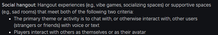 It looks like the maturity level is currently Unknown, not 13+ (although unrated experiences are only playable for 13+ users). And just to clarify, Social Hangouts without private spaces are Moderate / age-gated to 13+. If there are private spaces, it would make the experience Restricted / age-gated to ID-verified 17+.