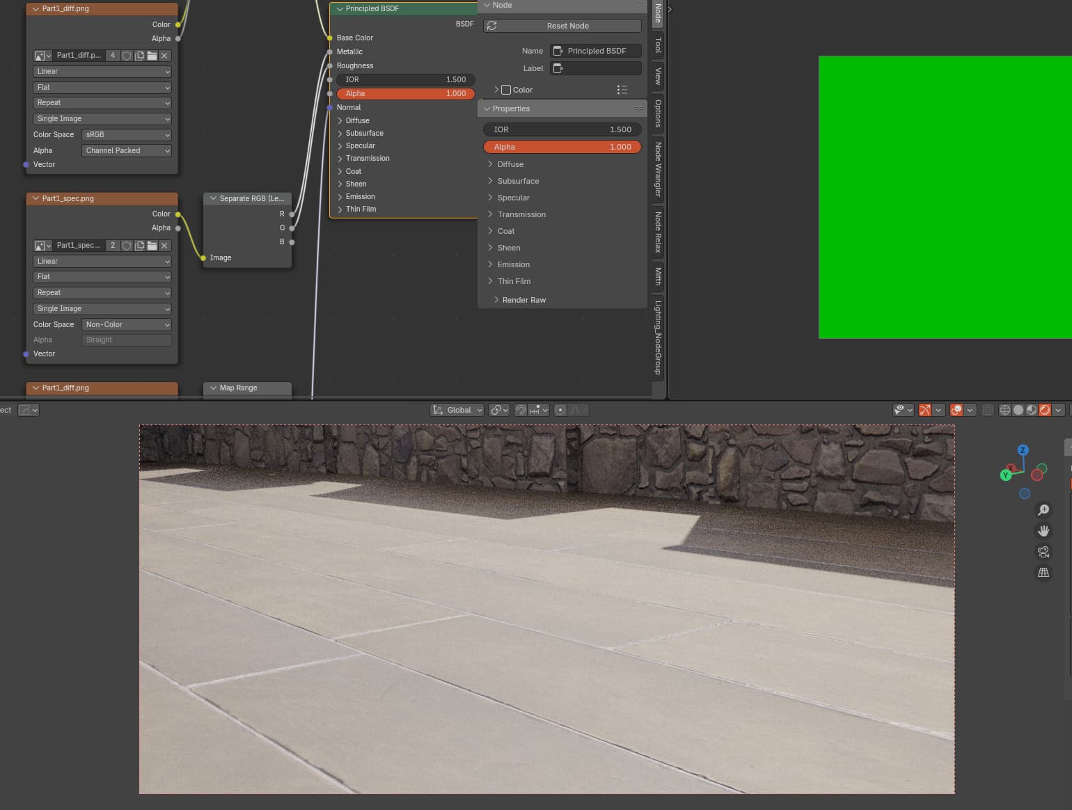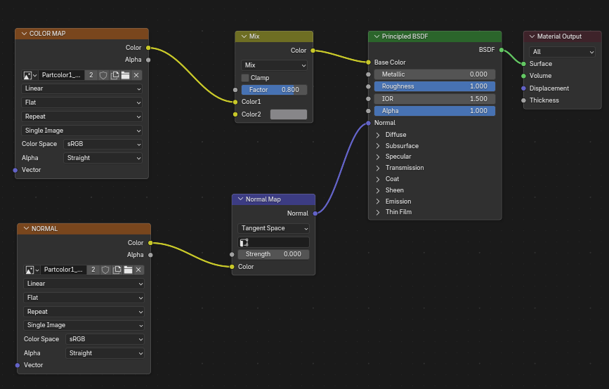 The diffuse map is applied correctly, but no part color is applied, leaving it with its default grey texture color. The specular map is essentially a single image with a solid color, which is inaccurate given that most materials have specular/roughness map with color variation. The normal map is also not applied at all due to the strength applied is 0. In addition, within Blender’s shader editor, the specular/roughness/normal maps typically use the “Non-Color” colorspace for the maps to be used properly.