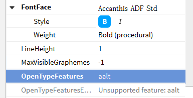 I want to use certain OpenType features from the Accanthis ADF Std font in Roblox Studio.