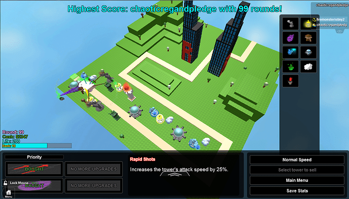 I found this game to be one of the most refined tower defense games on ROBLOX. Not only does it include a multitude of maps, but features ranging difficulties and a wide variety of enemies, towers, and effects. In order to play effectively, you must utilize each tower’s abilities to cohesively form a battle strategy that maximizes each tower’s damage output. Though this game hasn’t been updated for a full year, there are minimal bugs and I fully enjoyed my two hours spent playing until round 134.