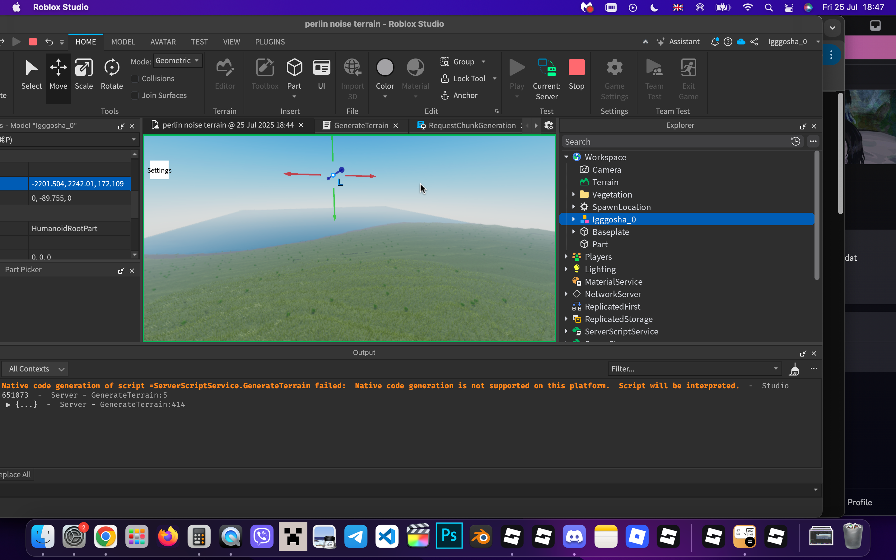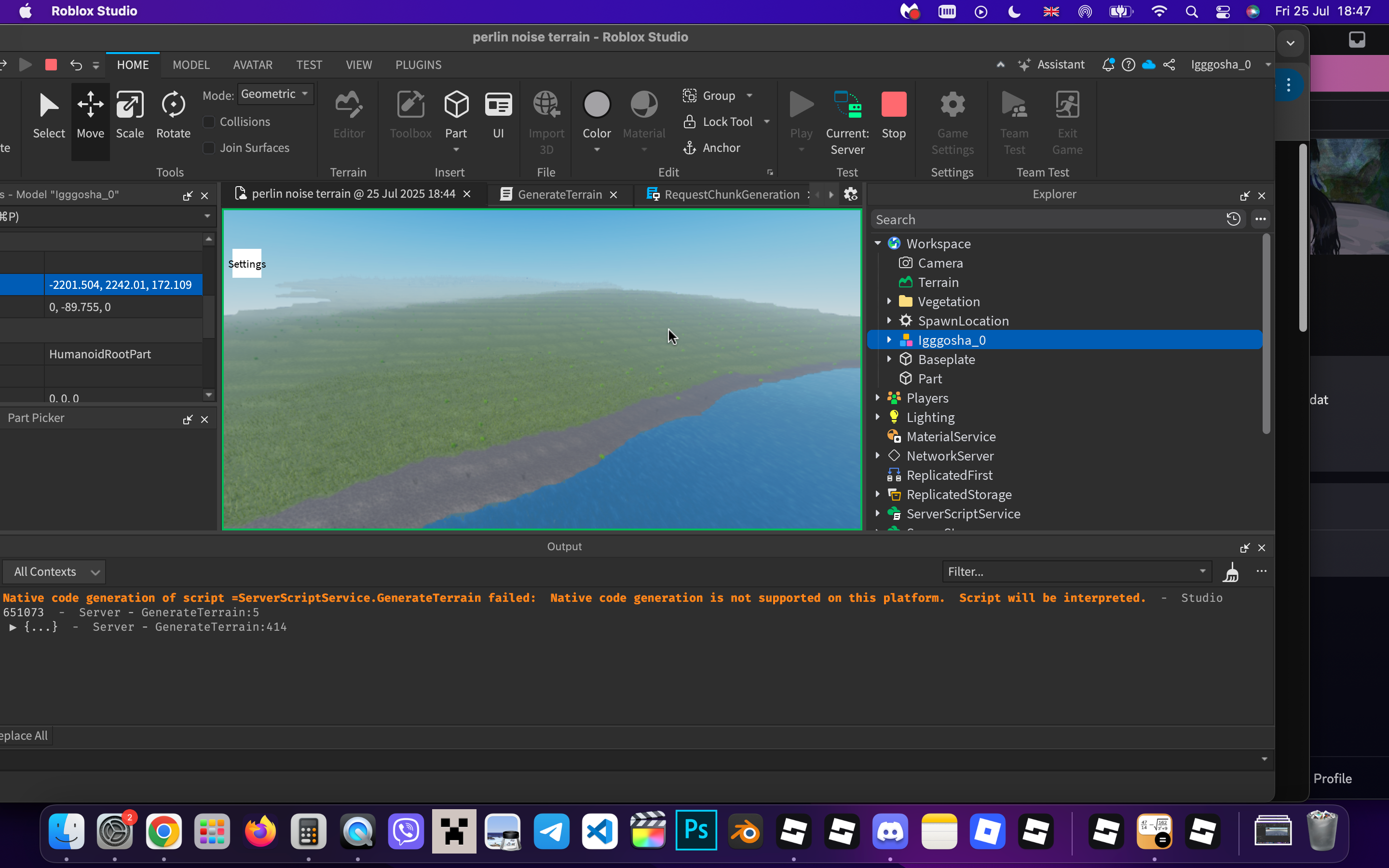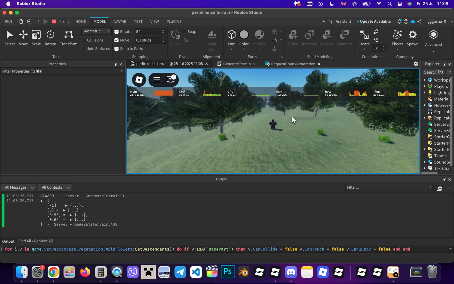 Today I decided to start working on a voxel terrain generator, using roblox’s terrain system. So far, I’m using a 4-layer perlin noise with height zones (a fifth large scale perlin map using a shifted seed that divides the world into mountains, highlands, plains and lowlands, which have their own multipliers for the 4 perlin layers).