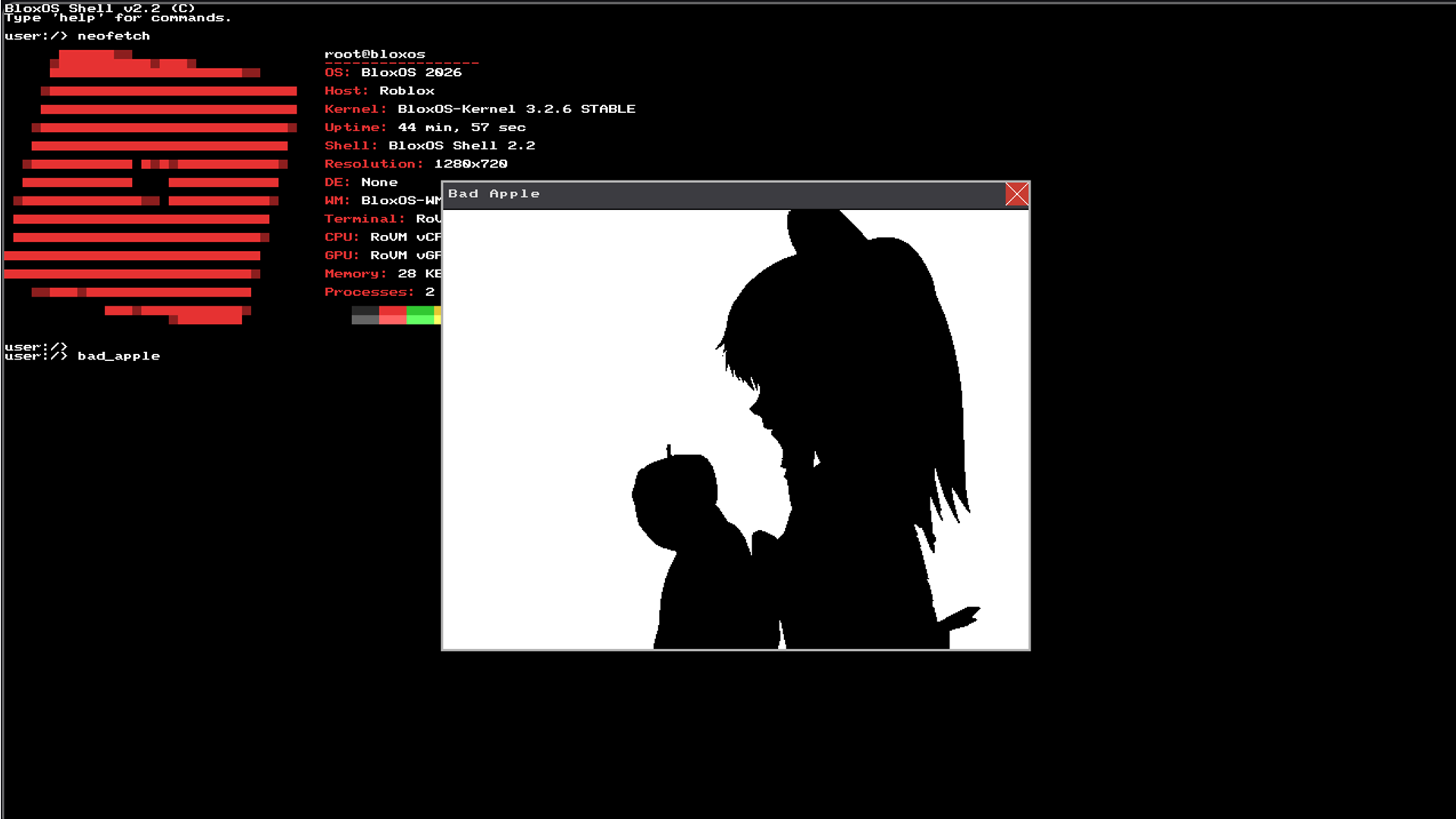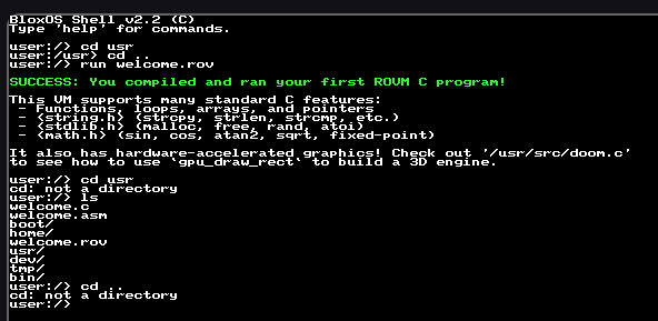 ROVM is a complete virtual computer running inside Roblox. This project started as an experiment to see how far Roblox’s runtime and Luau could be pushed, but it has since evolved into a full-fledged computer. It has its own CPU, a built in C compiler, assembly language, framebuffer, terminal, filesystem, and even virtual memory with copy-on-write. You can write programs for it in C or assembly and they actually run.