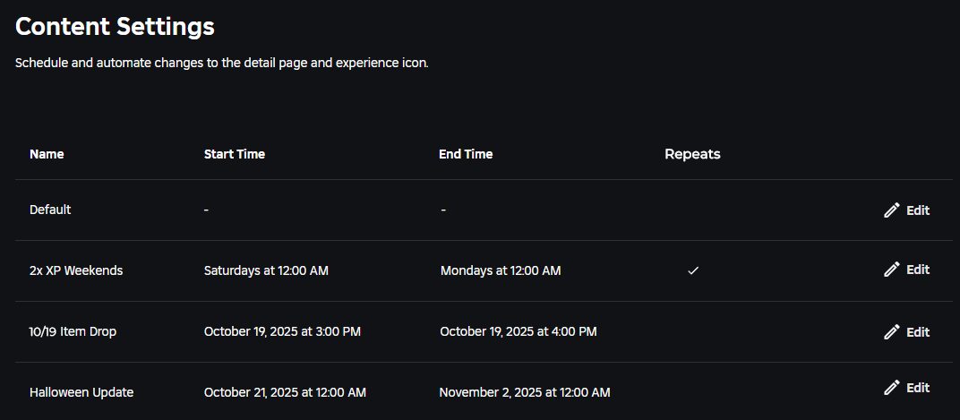 The settings page of an experience should include a tab to schedule temporary changes to descriptions, icons, and thumbnails for a game and allow you to repeat these changes on a schedule.