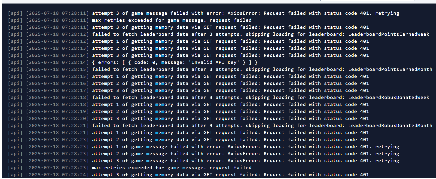 On top of that, while I was affected by the issue, I discovered another serious flaw: because it uses the same “not-approved” system as account moderation, the screen time limit completely breaks any Open Cloud API keys set up under your account or groups — essentially blocking your access as if you were banned.