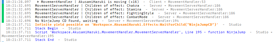 I’ve been slowly trying to figure it out and I’ve found out that for some reason the script simply is incapable of seeing specifically this value. First I put “effects:FindFirstChild(“NinjaJumpCD”)” This threw the error “NinjaJumpCD is not a valid member of AkusamiHaruki.Effects”. Then I made a for loop in order to see if the script can see NinjaJumpCD by iterating through the effects folder and printing the names, It can see everything but skips directly over NinjaJumpCD. I’ve done this same system before with a normal Dash, and it worked fine. a Local Script makes the value in the effects folder, and the Server Script deletes it once the Cooldown is over. But for some reason It’s just incapable of seeing the value this time.