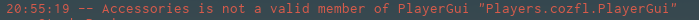 I have a script and it works fine in studio but in the developer logs in-game it says “Acessories is not a valid member of PlayerGui”
