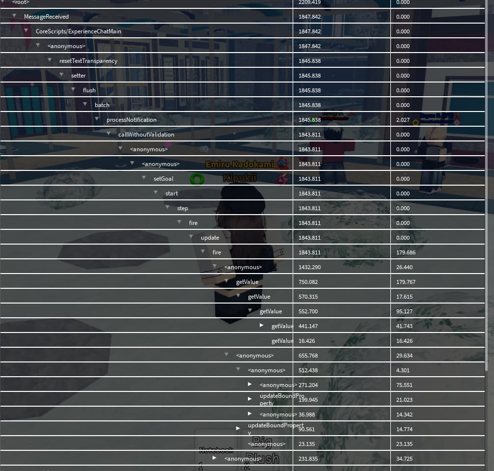 This is a screenshot in an early session before it gets chaotic. CoreScript/ExperienceChatMain appears to have many calls in this period. (Again, the ms grows over time resulting in larger lagspikes)