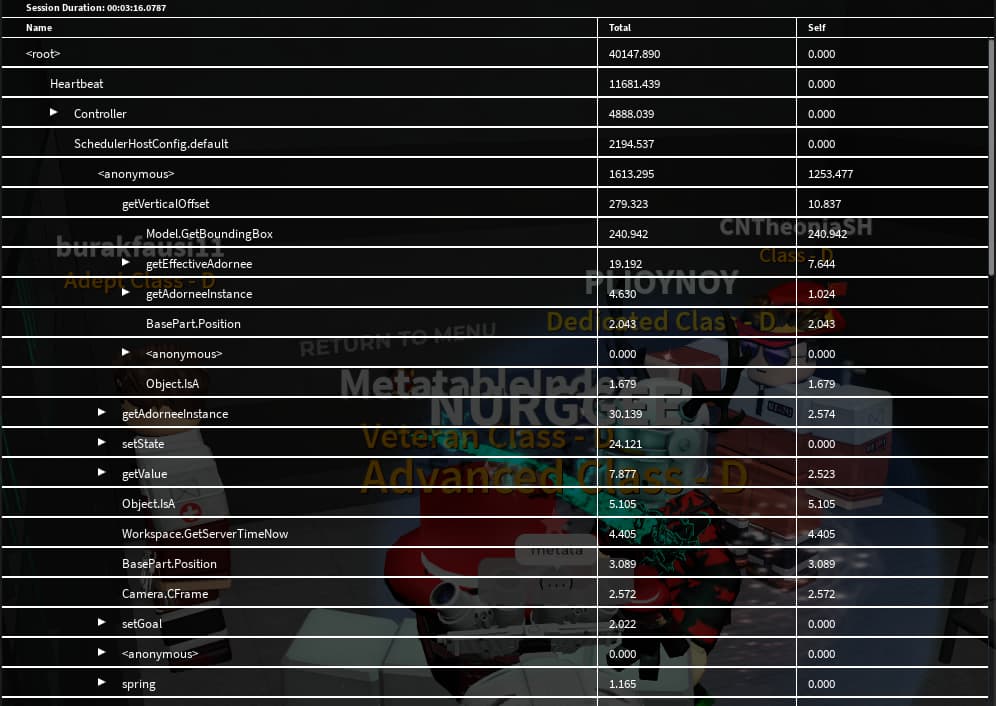 An obligatory note to avoid any confusion: Controller is a game-essential local script that handles gun and camera movement and controls, as well as replication of things such as lasers, equipped radios, etc., and is expected to increase in frame time usage with player count - even so, this increase should not warrant such a drastic drop in FPS, which is justified instead by Script_PlayerListManager, of which does indeed take a long amount of frame time much more considerable than Controller.